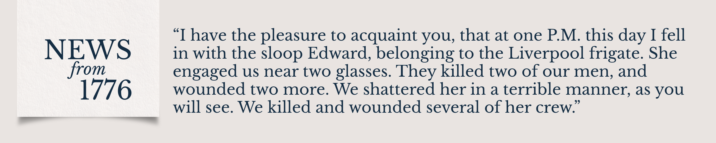 I have the pleasure to acquaint you, that at one P.M. this day I fell in with the sloop Edward, belonging to the Liverpool frigate. She engaged us near two glasses. They killed two of our men, and wounded two more. We shattered her in a terrible manner, as you will see. We killed and wounded several of her crew. I shall give you a particular account of the powder and arms taken out of her, as well as my proceedings in general. I have the happiness to acquaint you that all our people behaved with much courage. I am, gentlemen, your humble servant,