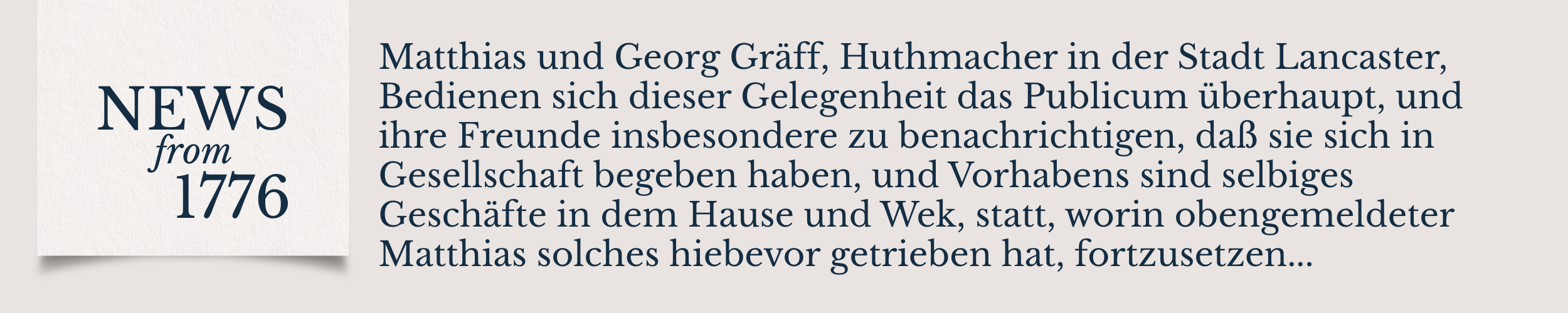 This advertisement announced a new partnership between Matthias and Georg Gräff, hatters in Lancaster, Pennsylvania. The two operated from the corner of Orange Street, where Matthias had conducted his previous hatmaking business. In addition to asking his old customers to settle their debts with him, Matthias gave notice of some specialty items for sale at the Gräffs’ shop, “nur für baar Geld,” or for cash only. These included gold and silver trimmings for hats. The Gräffs also had stocked dyestuffs to color hat materials. “Grünspan,” or verdigris, and “Kupferwasser,” literally copper water, created a blue-green dye. “Galläpfel,” or oak galls, were frequently used to create ink. “Blauholz,” or logwood, was a flowering tree that yielded a purple hue.