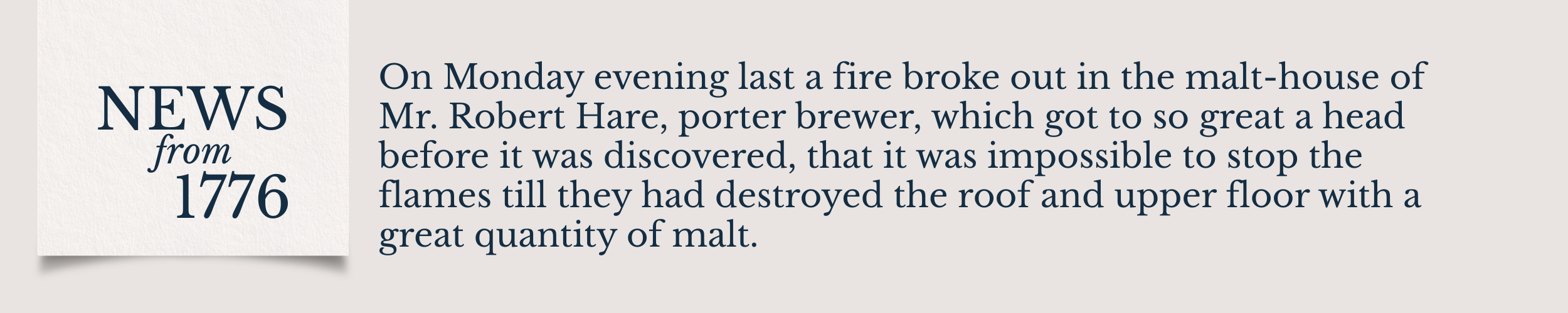 On Monday evening last a fire broke out in the malt-house of Mr. Robert Hare, porter brewer, which got to so great a head before it was discovered, that it was impossible to stop the flames till they had destroyed the roof and upper floor with a great quantity of malt.