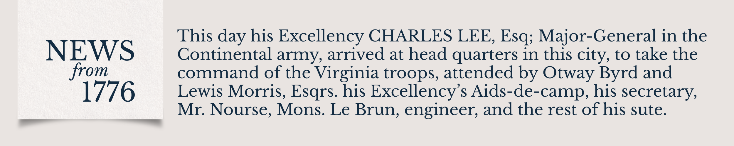 This day his Excellency CHARLES LEE, Esq; Major-General in the Continental army, arrived at head quarters in this city, to take the command of the Virginia troops, attended by Otway Byrd and Lewis Morris, Esqrs. his Excellency’s Aids-de-camp, his secretary, Mr. Nourse, Mons. Le Brun, engineer, and the rest of his sute.