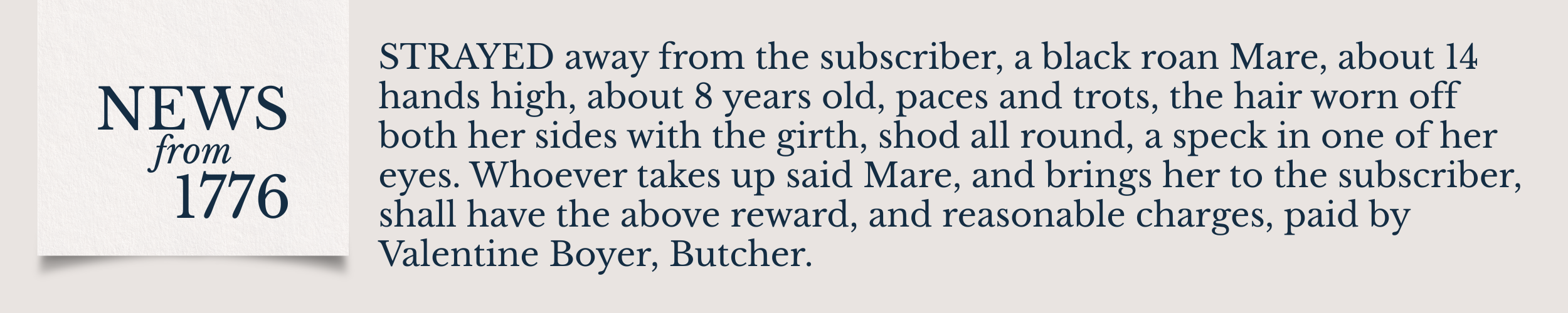 There was a Valentine in the Pennsylvania Gazette on February 14, 1776: Valentine Boyer, a butcher seeking the return of his horse. Advertisements for the return of animals that had strayed from someone’s property were a common feature of newspapers at this time. Boyer gave as many details as possible to distinguish his eight-year-old black mare from another, including her height, abilities, and even a speck in one of her eyes. Boyer’s advertisement was followed on the page by an offer of $16 reward for another eight-year-old horse, a sorrel mare, similarly described with all of her markings, that was “STRAYED or STOLEN” out of a pasture in Chester County in August 1775.