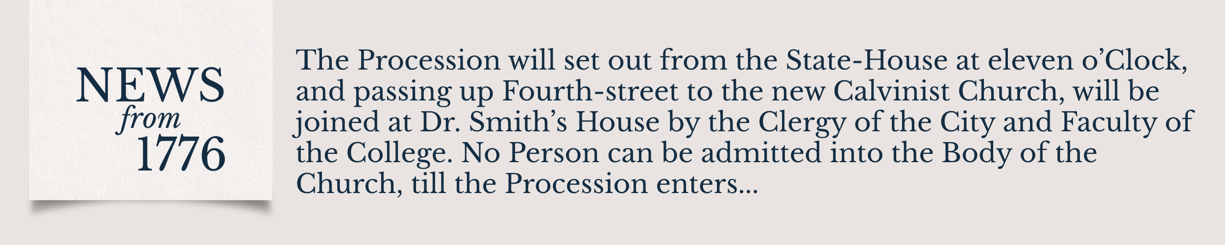 The Procession will set out from the State-House at eleven o’Clock, and passing up Fourth-street to the new Calvinist Church, will be joined at Dr. Smith’s House by the Clergy of the City and Faculty of the College. No Person can be admitted into the Body of the Church, till the Procession enters; but a Part of the Gallery, capable of containing about four hundred Persons, will be reserved for Ladies and Strangers, whose public Spirit may induce them to honor the Solemnity; and as they can only be introduced by Tickets, they will be pleased to apply for the same, to any of the following Gentlemen, viz. Mr. Bremner, Mr. Hare, Col. Bache, Capt. Peters, or Dr. Kuhn; and to be seated before eleven o’Clock.