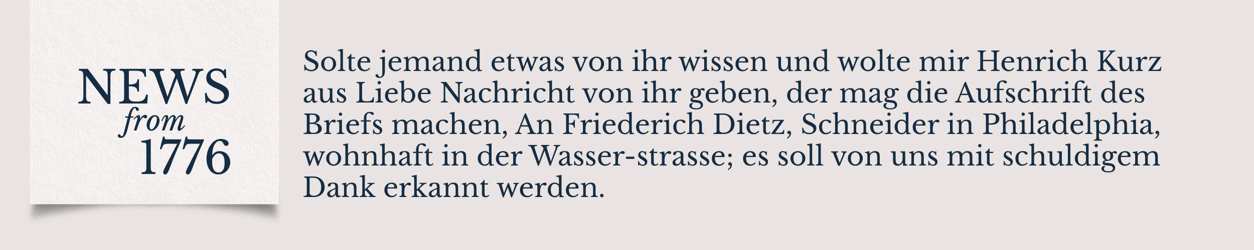 Henrich Kurtz made a simple request that, if anyone knew anything about his sister and wanted to give him news of her “aus Liebe,” out of love, he would be sincerely grateful. Rather than giving out his own address—perhaps he was newly arrived in Philadelphia—Kurtz asked for letters with information about Elisabeth to be addressed to Friedrich Dietz, a tailor on Water Street.