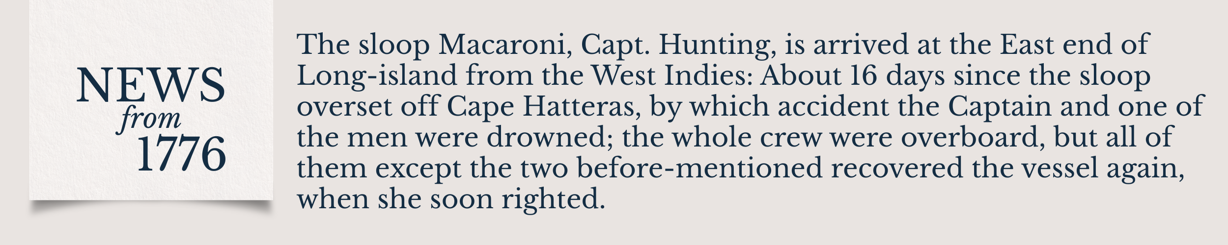 The sloop Macaroni, Capt. Hunting, is arrived at the East end of Long-island from the West Indies: About 16 days since the sloop overset off Cape Hatteras, by which accident the Captain and one of the men were drowned; the whole crew were overboard, but all of them except the two before-mentioned recovered the vessel again, when she soon righted.