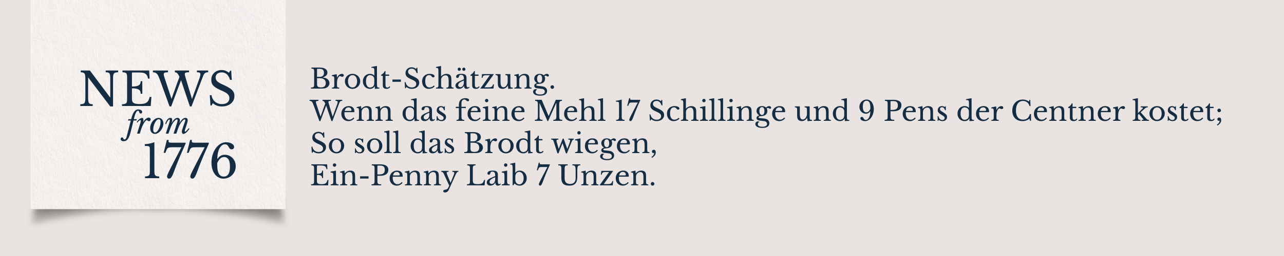 The price of bread has long been an important economic metric. Newspapers printed prices to give consumers a sense of how much they could expect to spend. In the Pennsylvanischer Staatsbote, the “Brodt-Schätzung,” or assize of bread, in February 1776 estimated that fine flour cost 17 shillings and 9 pennies per hundredweight, and the price of bread loaves was calculated from there. One penny would buy a 7-ounce loaf. Two pennies would buy a loaf weighing 15 ¼ ounces. Lesser quality flour was a bit cheaper, at 15 shillings per hundredweight, and rye flour was the least expensive, at 10 shillings per hundredweight. Comparing bread estimates over time shows how this staple could impact a family’s finances. One year earlier, in February 1775, the “Brodt-Schätzung” in the Staatsbote indicated that a one-penny loaf made with fine flour was smaller, at 6 ¾ ounces.