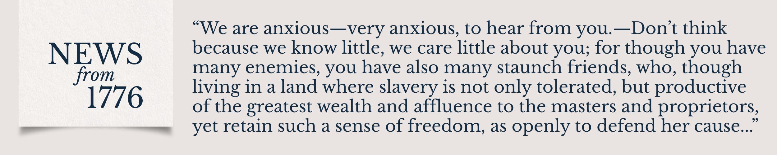 “We are anxious—very anxious, to hear from you.—Don’t think because we know little, we care little about you; for though you have many enemies, you have also many staunch friends, who, though living in a land where slavery is not only tolerated, but productive of the greatest wealth and affluence to the masters and proprietors, yet retain such a sense of freedom, as openly to defend her cause, and with zeal and warmth side with the Americans in their present glorious struggle for the restoration of such of their natural and stipulated liberties as have been wrested from them; and the preservation of such as yet remain. The conquest of America by all the troops Britain has or can send from her island, appears to me the most idle and chimerical plan ever adopted by a minister, with less than half Lord North’s abilities. I can’t help thinking the minister, before this, must be convinced that Americans not only can, but will fight; and in order to enforce the present measures, a much greater force than they have or can send, will be necessary; and therefore he induced to propose some method of accommodation, not unworthy AMERICANS to accede to. That you will finally succeed, I not only hope, but believe.