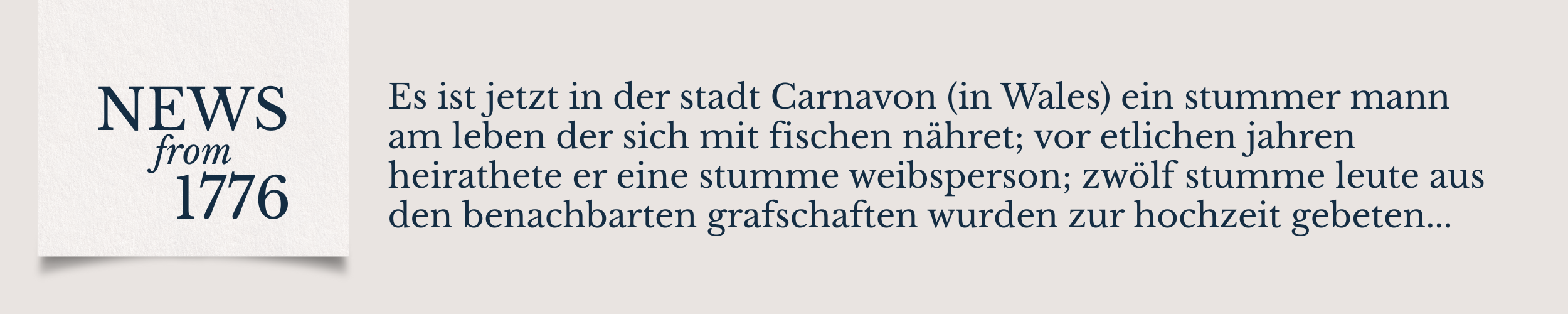 Es ist jetzt in der stadt Carnavon (in Wales) ein stummer mann am leben der sich mit fischen nähret; vor etlichen jahren heirathete er eine stumme weibsperson; zwölf stumme leute aus den benachbarten grafschaften wurden zur hochzeit gebeten; daß jawort bey der trauung wurde so gegeben, daß zwey personen für sie antworteten nachdem sie ihre einwilligung durch zeichen zu verstehen gegeben hatten.