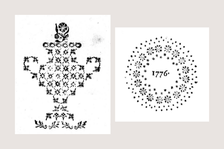 In this advertisement in the Pennsylvanischer Staatsbote, Saur, Jr. advertised that he had just finished printing Der Tod Abels, which was available to purchase from his father’s house in Germantown. He noted that the few books which had been imported from Germany—one of which presumably served as the source text for his printing—sold for 10 shillings each. Saur, Jr.’s edition was available for 3 shillings each or 30 shillings per dozen. Saur, Jr.’s pricing highlighted the benefits of local productions as compared to imported books, and he made his mark on the text with these designs constructed from type ornaments: an urn on the title page, and the year of his publication surrounded by a sunburst.