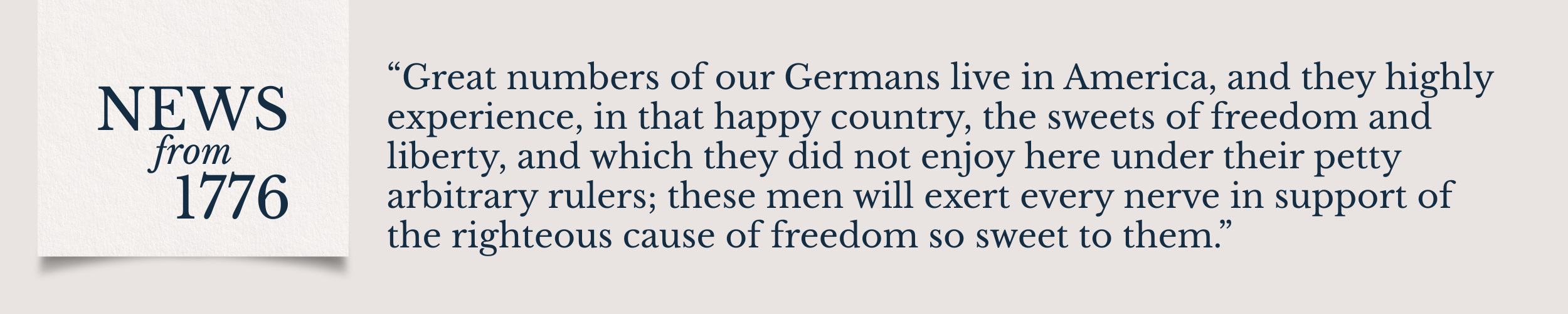 “Great numbers of our Germans live in America, and they highly experience, in that happy country, the sweets of freedom and liberty, and which they did not enjoy here under their petty arbitrary rulers; these men will exert every nerve in support of the righteous cause of freedom so sweet to them. Their numerous friends and relations here are constantly and most ardently supplicating the great Divine Ruler of all events to interpose and assist you with the almighty arm, and to set at naught all the wicked enslaving attempts of your enemies, but they hope you will not fold your arms, and depend altogether on the efficacy of your praying friends, but that you will make use of defensive means, and they hope and believe that providence will be propitious to your cause, which you have already had an earnest of, and that your oppressors may be discomfited. We wish that as England is going to hire foreign troops, in vain hope of subduing you (their own men becoming enervated and spiritless so soon as they tread the American soil) that they could obtain Germans to be sent on this errand; for in that case we foresee the event would turn in your favour, as you have an extensive country for Germans to cultivate, and no people love profitable labour better, or are better adapted for the purpose, which America has long experienced, and we know that they would soon drop their fire arms, and betake themselves to the cultivation of lands. We think highly of the wisdom of your American Congress, and of all their good regulations throughout that extensive continent, and we cannot enough admire the decent, loyal, yet manly and spirited language contained in all their petitions and supplications to the throne, and cannot enough detest the indecent treatment and scornful reception they have met with from those haughty men who guide all the movements of the nation.