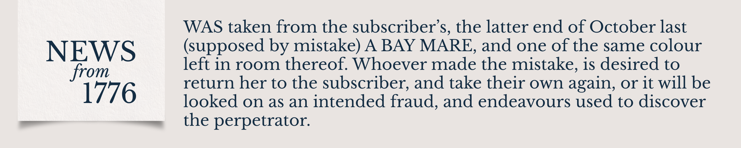 WAS taken from the subscriber’s, the latter end of October last (supposed by mistake) A BAY MARE, and one of the same colour left in room thereof. Whoever made the mistake, is desired to return her to the subscriber, and take their own again, or it will be looked on as an intended fraud, and endeavours used to discover the perpetrator.