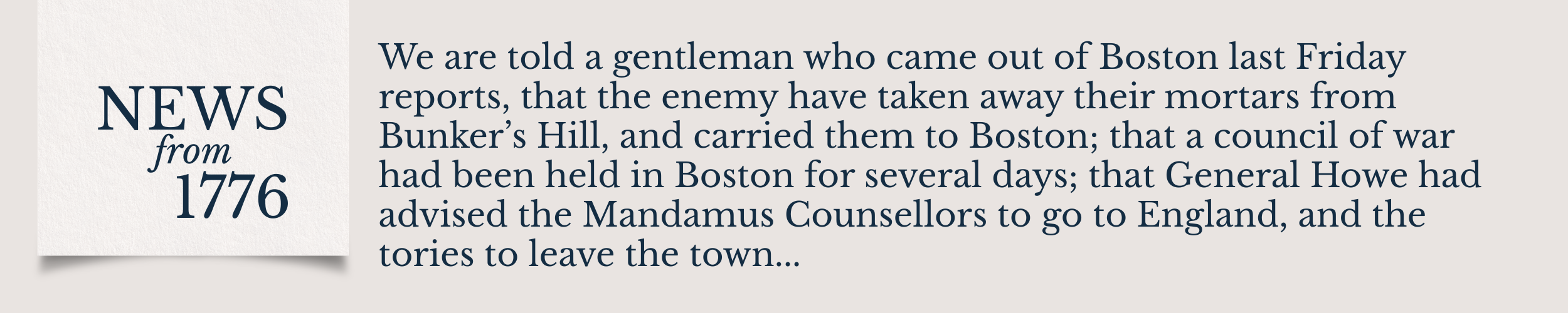 We are told a gentleman who came out of Boston last Friday reports, that the enemy have taken away their mortars from Bunker’s Hill, and carried them to Boston; that a council of war had been held in Boston for several days; that General Howe had advised the Mandamus Counsellors to go to England, and the tories to leave the town; that all the vessels in the harbour that were not in the King’s service, were taken up to transport the tories and their effects; and that it was surmised in Boston, that should another battle ensue, and the regulars be defeated, they would set fire to the town, and remove to some other part of the continent.