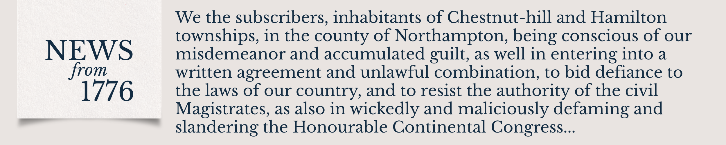 On March 1, 1776, five men in Northampton County, north of Philadelphia, were censured by the local committee. As a result, they issued a statement to be printed in the English and German newspapers in the area. The men—Johannes Ziglin, Sr., Johannes Ziglin, Jr., Thomas James, Jacob Hipge, and Edward Evans—had all entered “into a written agreement and unlawful combination, to bid defiance to the laws of our country, and to resist the authority of the civil Magistrates, as also in wickedly and maliciously defaming and slandering the Honourable Continental Congress.” The reason for their refusal to accept these authorities is not clearly stated. But clearly, they were believed to be threats to their community.