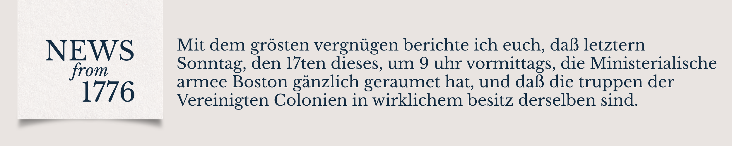 Mit dem grösten vergnügen berichte ich euch, daß letztern Sonntag, den 17ten dieses, um 9 uhr vormittags, die Ministerialische armee Boston gänzlich geraumet hat, und daß die truppen der Vereinigten Colonien in wirklichem besitz derselben sind. Ich bitte um erlaubniß, mein Herr, euch und dem achtbaren Congreß über diesem glücklichen vorgang meine mit freude zu bezeugen; und zwar besonders, weil es bewerkstelliget wurde, ohne das leben und eigenthum der noch übrigen unglücklichen einwohner in gefahr zu setzen.