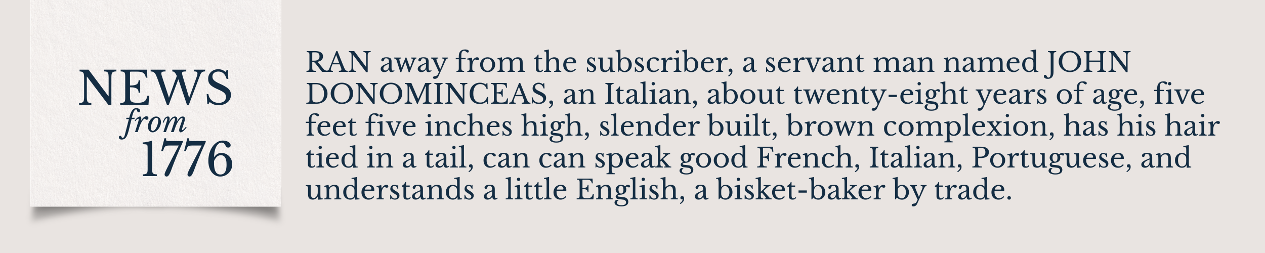 Many advertisements for runaway servants described the person’s physical features and ethnicity in an effort to recover the individual. Apart from advertisements for enslaved people and indentured Black servants, the people advertised in Philadelphia in 1776 were often German, Dutch, or Irish. In this case, the servant was Italian. John Donominceas ran away from John Peters, who described his servant as a twenty-eight-year-old man with a slender build and his hair in a ponytail. Donominceas was a biscuit baker. He was also multilingual, able to “speak good French, Italian, Portuguese,” and understood “a little English.”