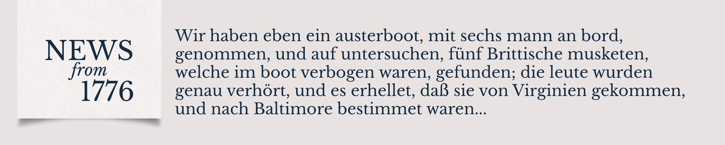 Wir haben eben ein austerboot, mit sechs mann an bord, genommen, und auf untersuchen, fünf Brittische musketen, welche im boot verbogen waren, gefunden; die leute wurden genau verhört, und es erhellet, daß sie von Virginien gekommen, und nach Baltimore bestimmet waren: Sir hatten austern an bord, ihr vorhaben zu verheelen und zu befördern, indem sie von jenem schandvollen mietlinge der Regierung, dem Lord Dunmore, als auspäher angestellet waren nachricht und erforschungen von dem zustant eurer stadt zu sammlen und eure vestungswerke zu besichtigen, &c.—Sie sind alle in gehöriger verhaft.—Man hoffet, ihr werdet auf guter hut seyn, und alle verbächtige personen und fahrzeuge sorgfältig untersuchen."