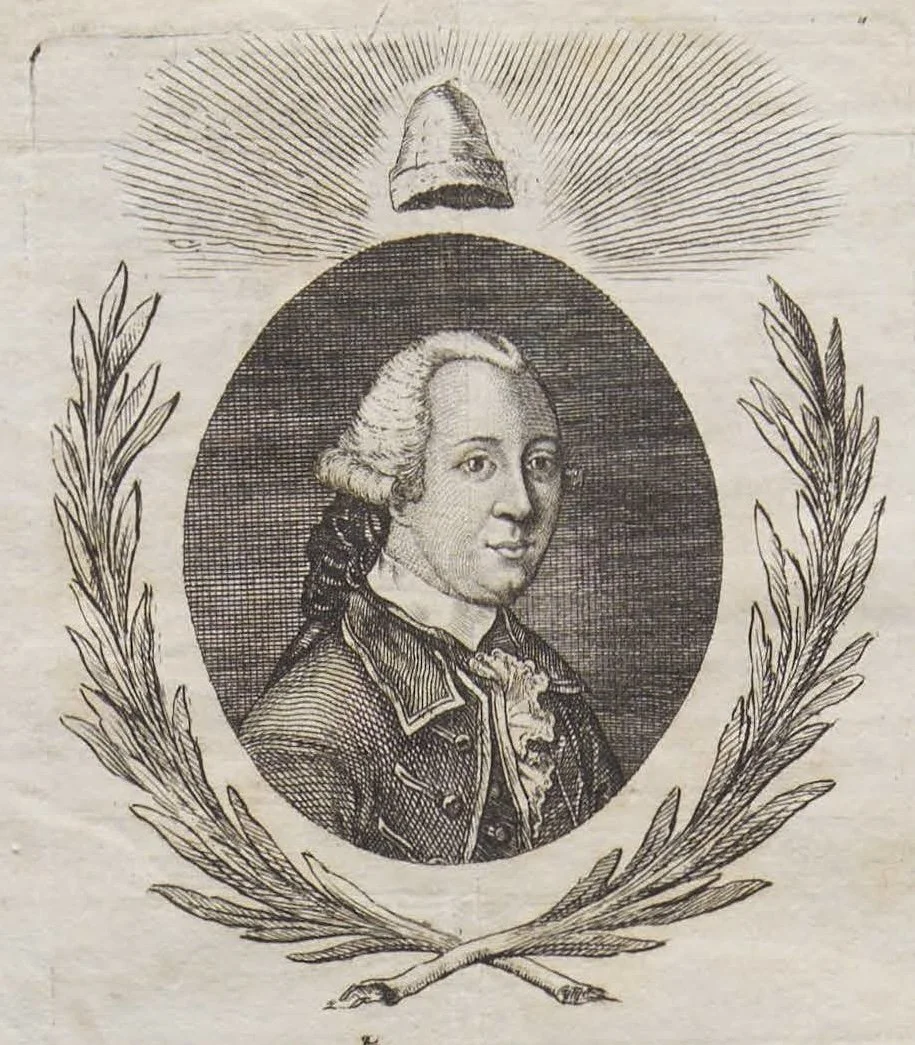 John Hancock, the president of the Continental Congress, sits at the top of this London broadside. Although the portrait was not labeled, it would have been obvious that Hancock—one of only two names within the printed Declaration—was the subject. His oval portrait is surrounded by branches and a radiant liberty cap, symbolizing his leadership in the fight for the colonists’ rights.