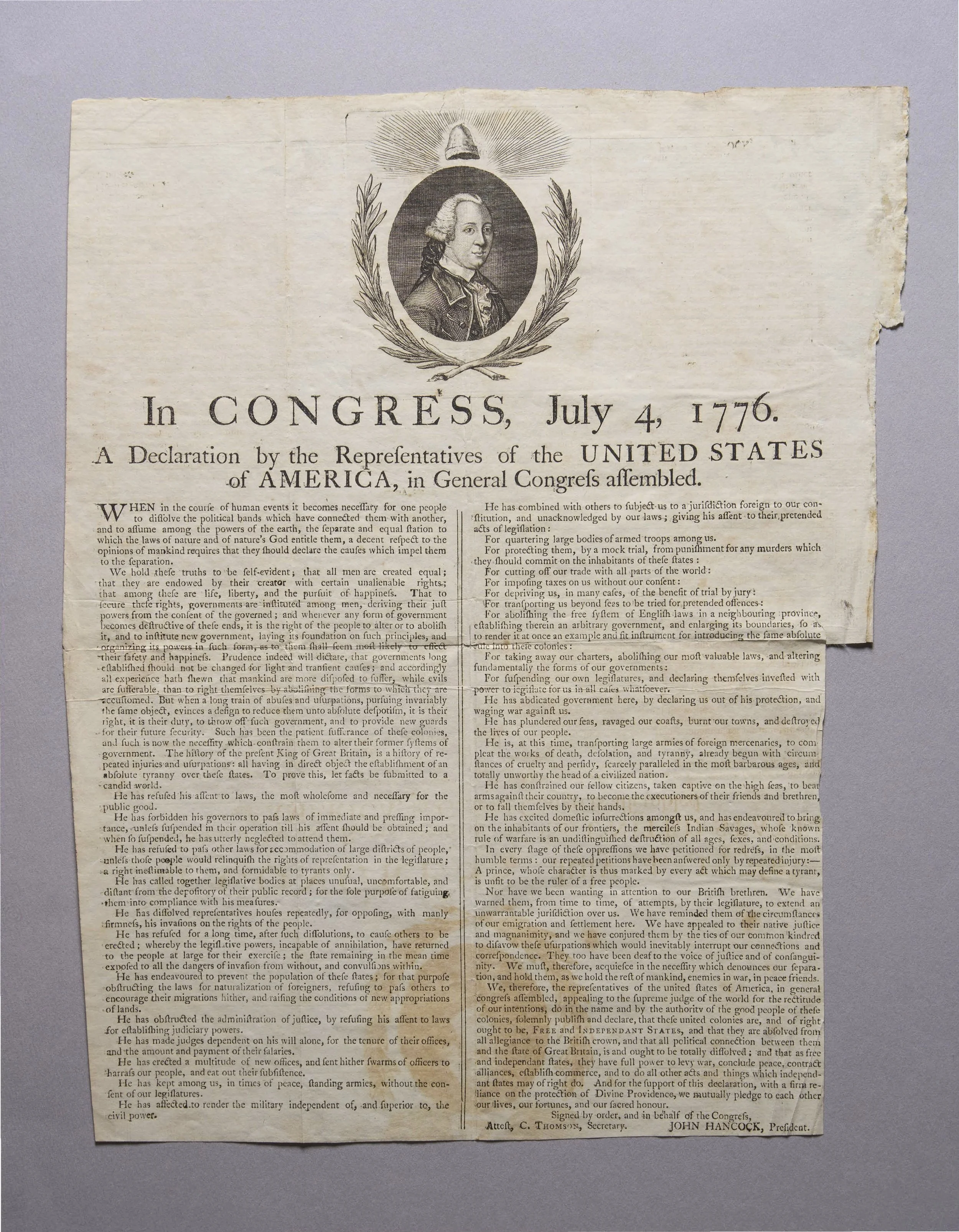 There are two known surviving copies of the London broadside—one intact, at the John Carter Brown Library, and one missing the top part of the sheet, at the Library Company of Philadelphia. The John Carter Brown Library’s copy was, for a time, folded in half and bound into a book. When it was later cut out, the right margin of the document became mutilated. Another remnant of the broadside’s time in binding is the ghostly image of John Hancock reflected on the bottom part of the sheet, where the ink transferred over time.