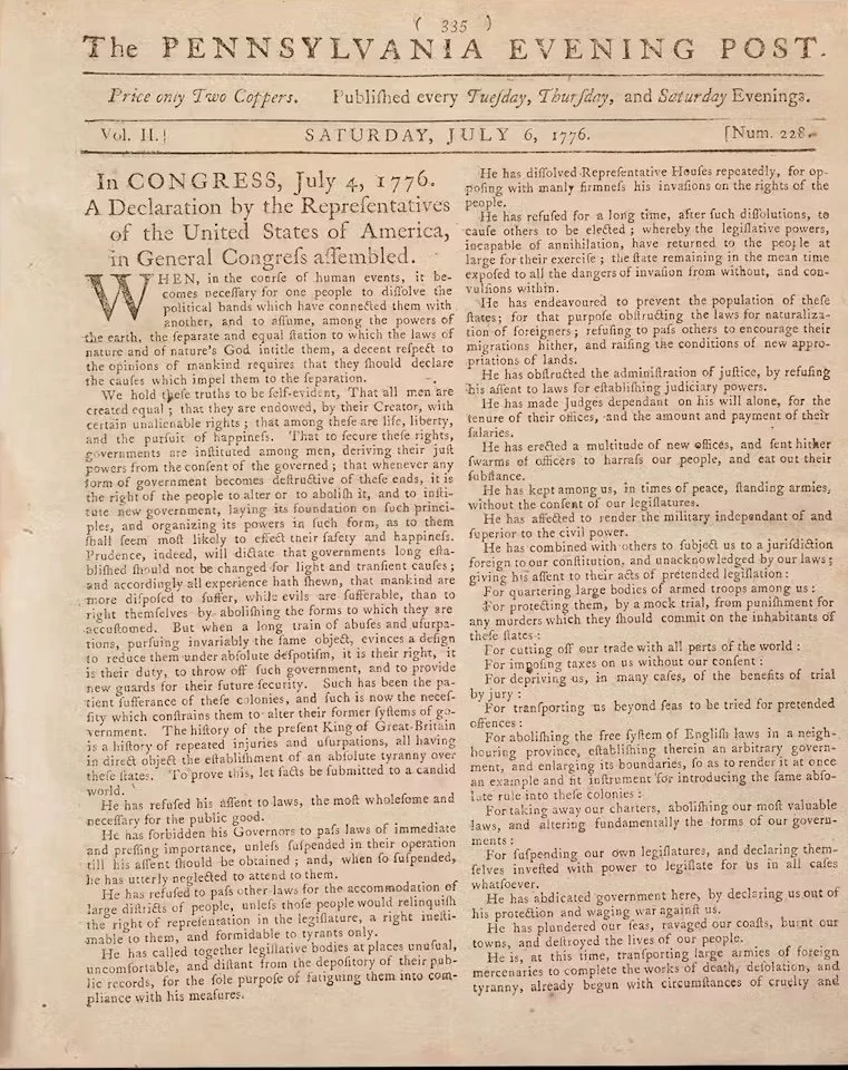 Where does the Pennsylvania Evening Post fit in The Declaration’s Journey? Alongside the German broadside printed in Philadelphia around the same time, Benjamin Towne’s newspaper printing of the Declaration shows the relatively humble beginnings of the text that has inspired countless political and social movements around the world. In the same pages as the founding document of the United States, Towne included a notice to his subscribers that, if they did not settle their accounts with him immediately, he would “soon be under the disagreeable necessity of DROPPING the Pennsylvania Evening Post, the price of paper and other articles being so greatly advanced.” Printers in 1776, including Towne, recognized the importance of the Declaration and prioritized it despite paper shortages and other precarities of revolutionary times. Other documents in The Declaration’s Journey from other moments in time, from Chile in 1812 to Ireland in 1916, hold similar stories. Be sure to visit the Museum of the American Revolution between October 18, 2025 and January 3, 2027 to see the Pennsylvania Evening Post and many other interesting objects!