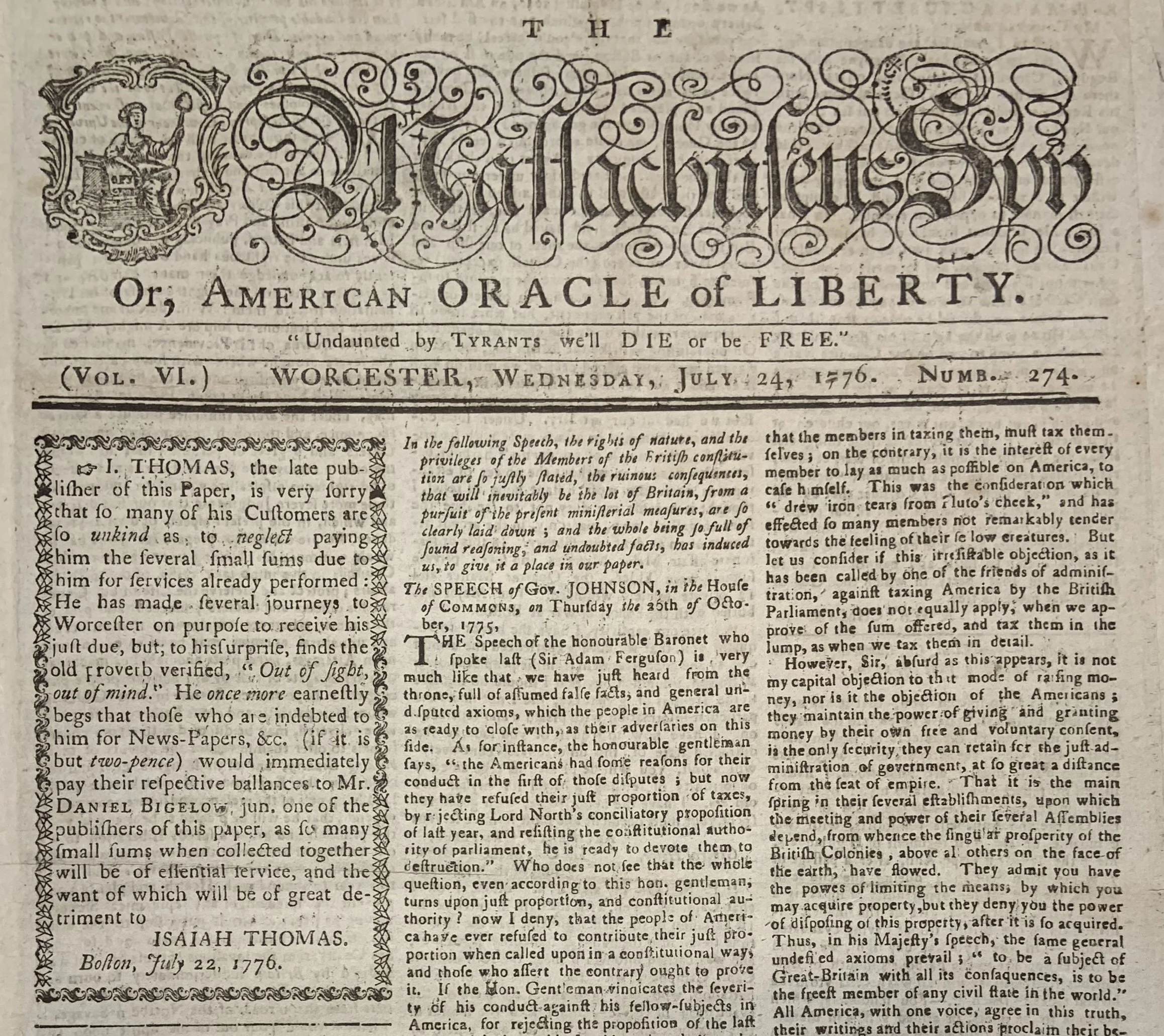 Then in June 1776, Thomas handed over his Worcester business to William Stearns and Daniel Bigelow. In an advertisement to readers of the Spy, Stearns and Bigelow explained that Thomas had “relinquished the Printing business in Worcester,” and that they were taking over his office and would “perform the various branches of said business with the utmost care and fidelity.” Staking their own claim as patriotic printers, they stated that, “at a time when OUR ALL is at stake, when no less than the fate of the STATES of AMERICA is in agitation, then (of all times) the means of conveying intelligence ought to be encouraged.” Stearns and Bigelow highlighted the importance of the “liberty and free exercise of the PRESS,” which was a “terrific scourge to tyrants.” In short, they tried to present themselves as worthy successors to the firebrand Thomas.