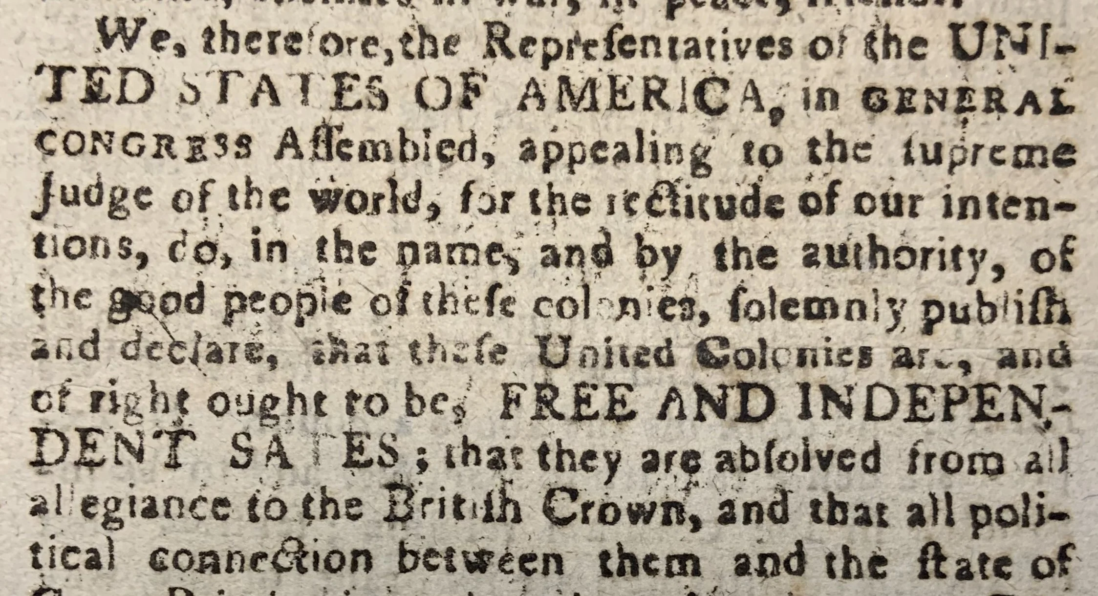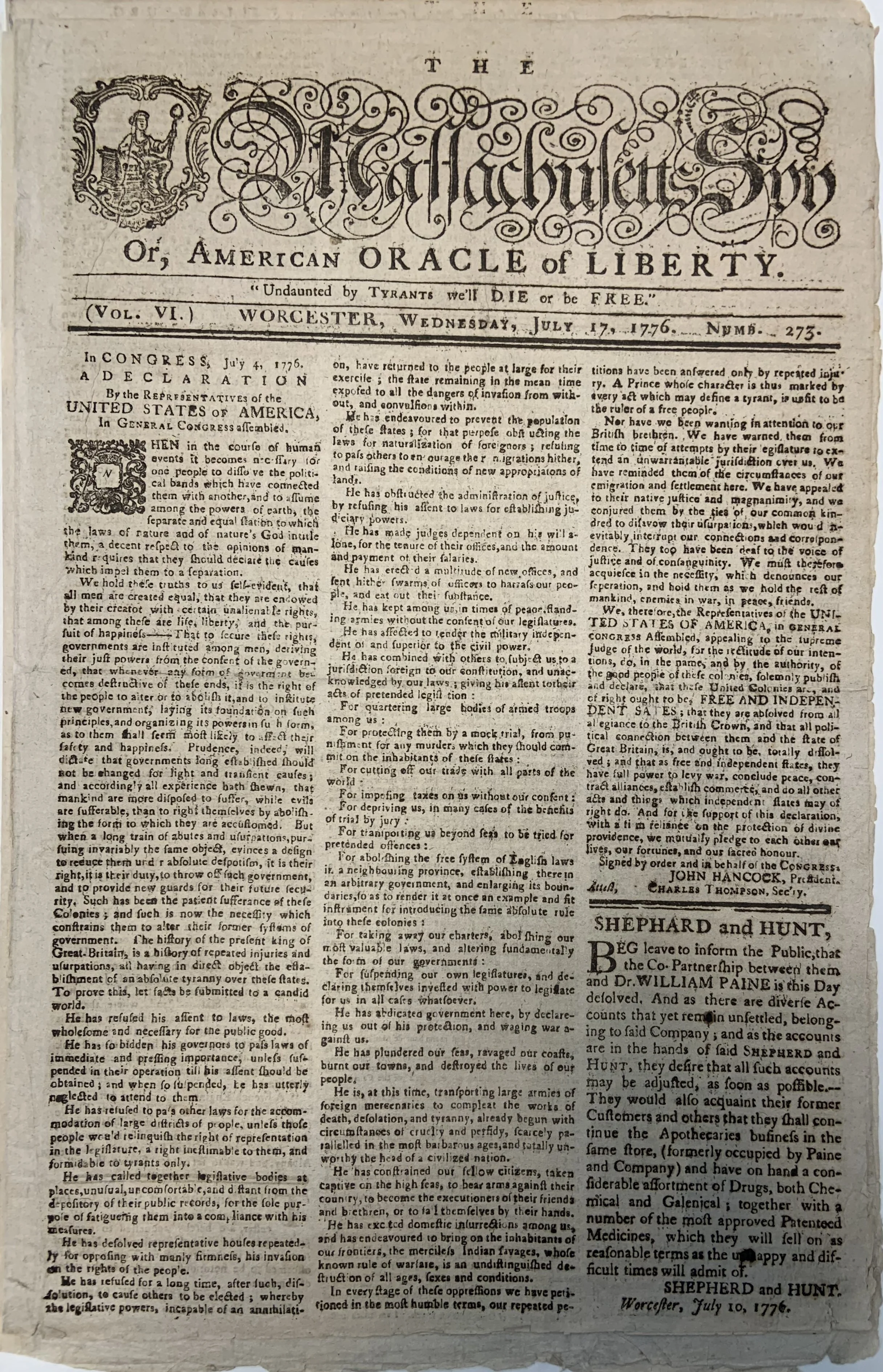 Although Isaiah Thomas was one of the most famous pro-independence printers in the colonies, he did not have the opportunity to print the Declaration of Independence. Instead, Stearns and Bigelow did. And, as Thomas might agree, they squandered the opportunity. When they printed the Declaration on the front page of the Spy on July 17, 1776, Stearns and Bigelow did not take particular care with their typesetting. The iconic opening of the second sentence was rendered as “We hold these truths to us self-evident…” Thanks to either an upside down “r” or a rogue “t,” the word “creator” appeared as “creatot.” Government was spelled “goverment.” And the final paragraph of the Declaration announced that the united colonies were “FREE AND INDEPENDENT SATES.” Other printing offices made errors when typesetting the Declaration of Independence, but nowhere near the number made in Isaiah Thomas’s former office.