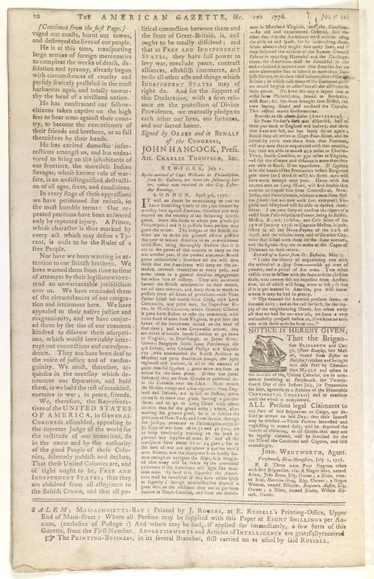 On Tuesday, June 18, 1776, John Rogers printed the first issue of the American Gazette, or the Constitutional Journal in Salem, Massachusetts. He did not have his own printing press. He was working out of the office of a more established printer, Ezekiel Russell.