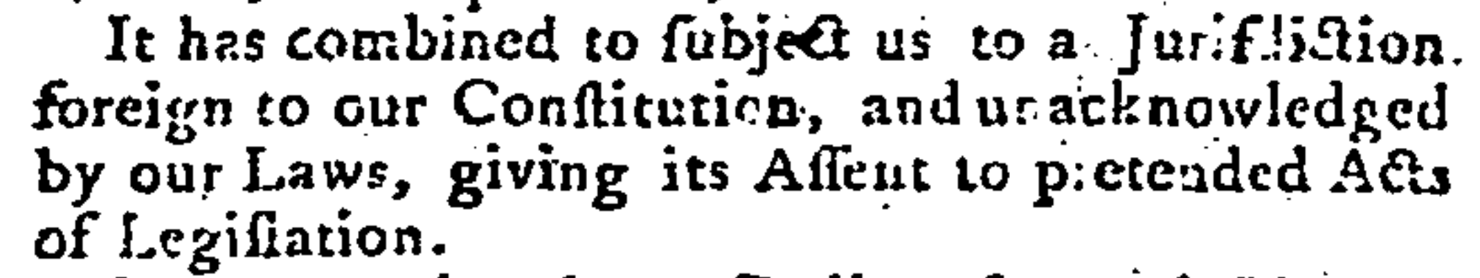 It has combined to subject us to a Jurisdiction foreign to our Constitution, and unacknowledged by our Laws, giving its Assent to pretended Acts of Legislation.
