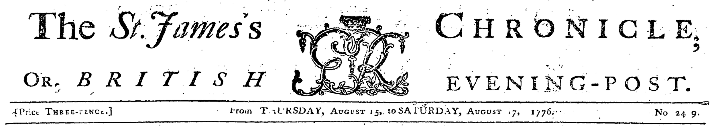 When the Declaration of Independence was printed in London, beginning on August 16, publishers made interesting choices to censor the text. Perhaps the most intriguing censorship strategy—and certainly the most difficult to execute—can be found in the St. James’s Chronicle; Or, British Evening-Post. This newspaper was printed three times a week, and the issue which included the Declaration covered August 15–17, 1776.