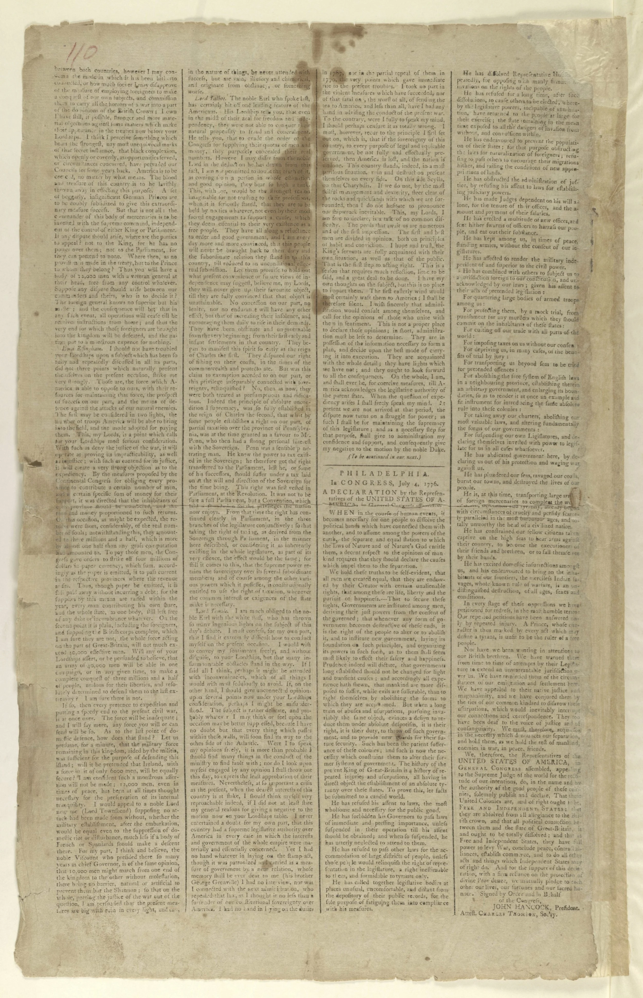 The text took up a column and a half of the four skinny columns per page of his newspaper. On the opposite page, Loudon included brief accounts of the reading of the Declaration at the head of the Continental Army on July 9 and the destruction of the statue of the king that evening.