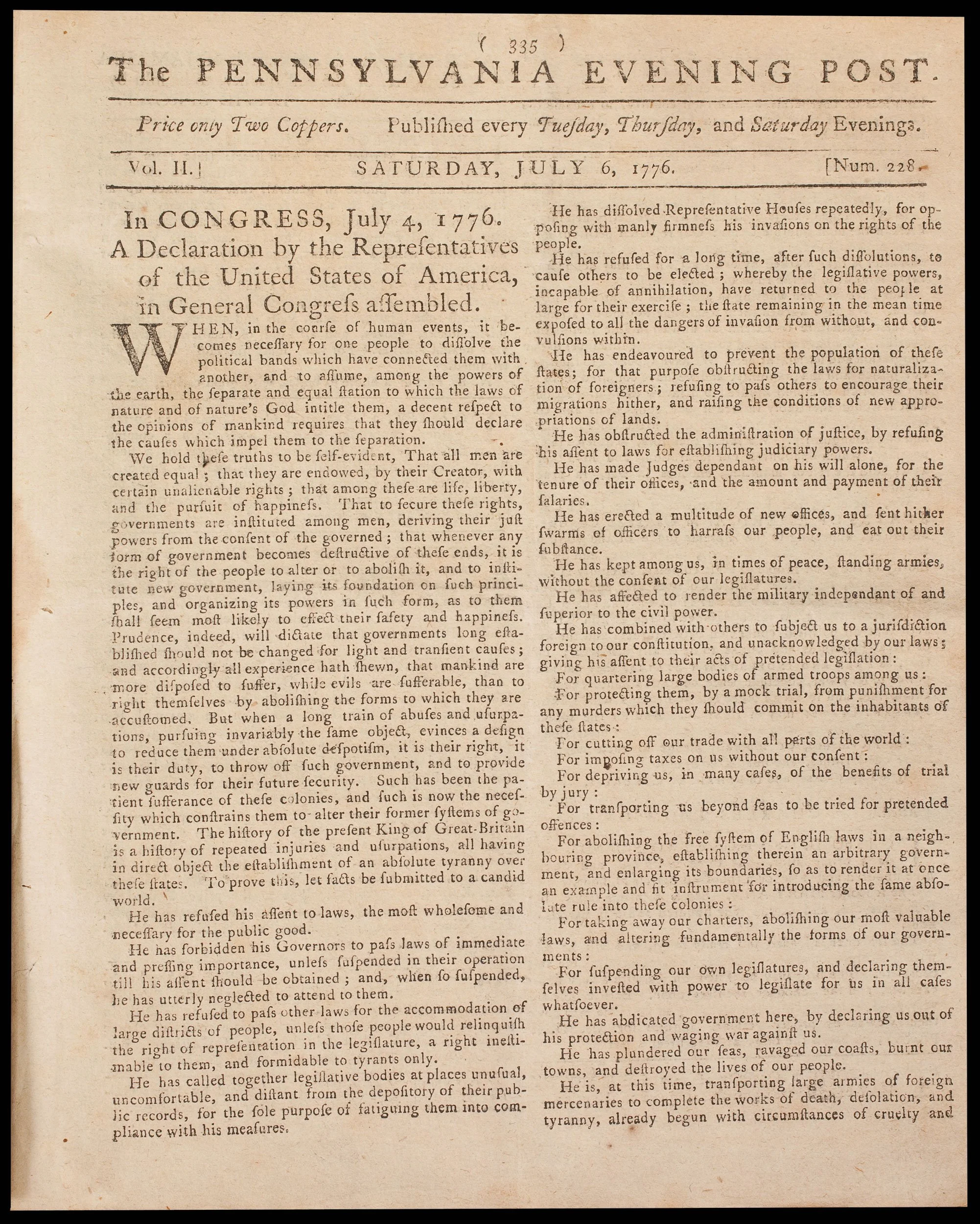 On July 7, 1776, John Adams wrote a letter to Abigail explaining that he had “this Moment folded up a Magazine, and an Evening Post and sent it off, by an Express, who could not wait for me to write a single Line.” The most recent issue of the Pennsylvania Evening Post, printed on Saturday, July 6, was the first newspaper printing of the Declaration of Independence. A number of extant copies of the Evening Post survive, though it is unclear if any of them are the copy John sent to Abigail on that Sunday in July 1776.