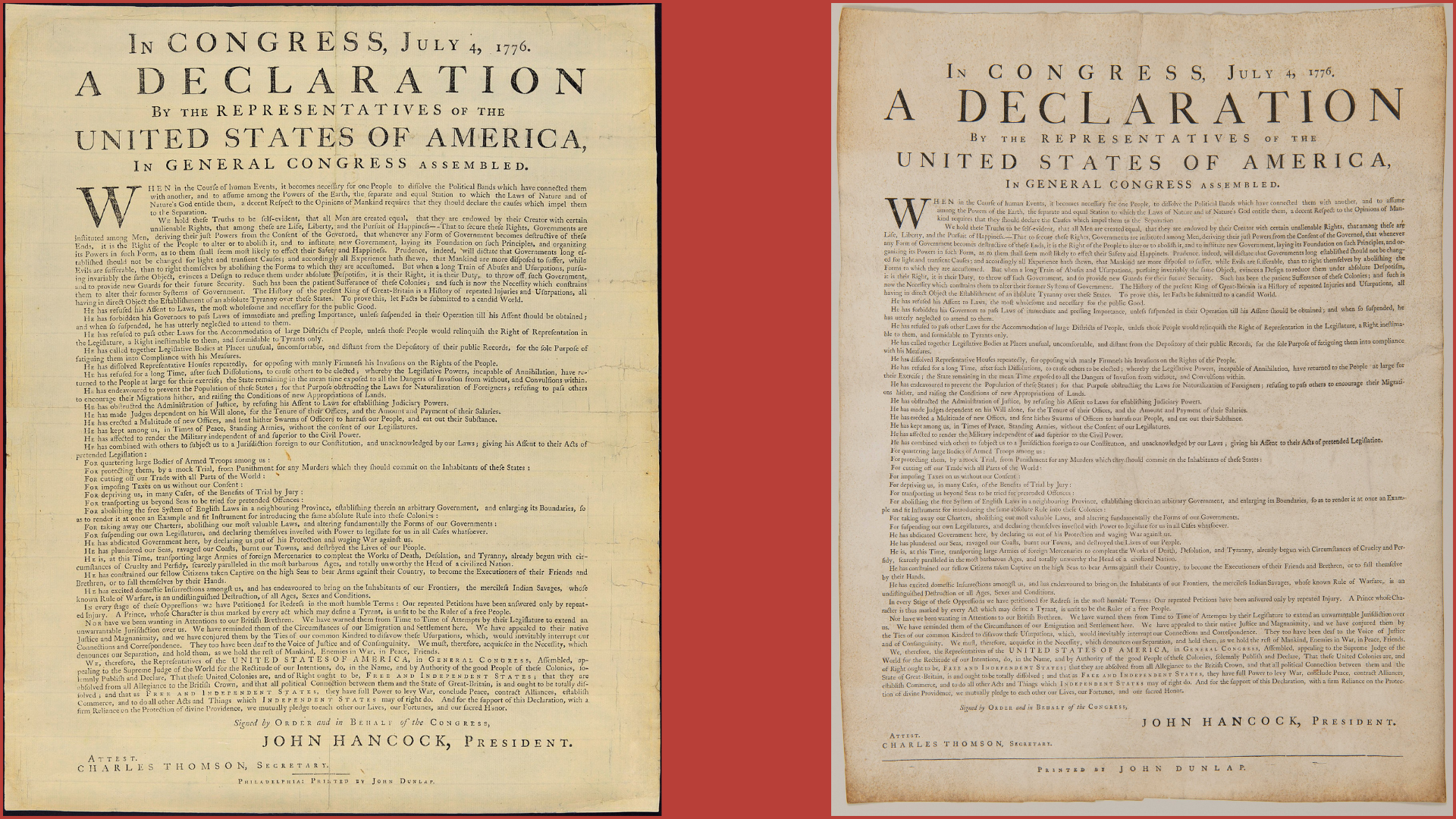His typesetters had to assemble the text from scratch, and they used a wider form. Instead of pressing the ink onto a sheet of paper, Dunlap imprinted the Declaration on a piece of vellum, or parchment made from calfskin. There is no clear record of why Dunlap made it. Perhaps the Continental Congress had asked Dunlap to print the Declaration on something more durable than paper. Maybe they considered signing a printed rather than handwritten parchment. It is possible that Dunlap produced this broadside of his own volition, for his own reasons.