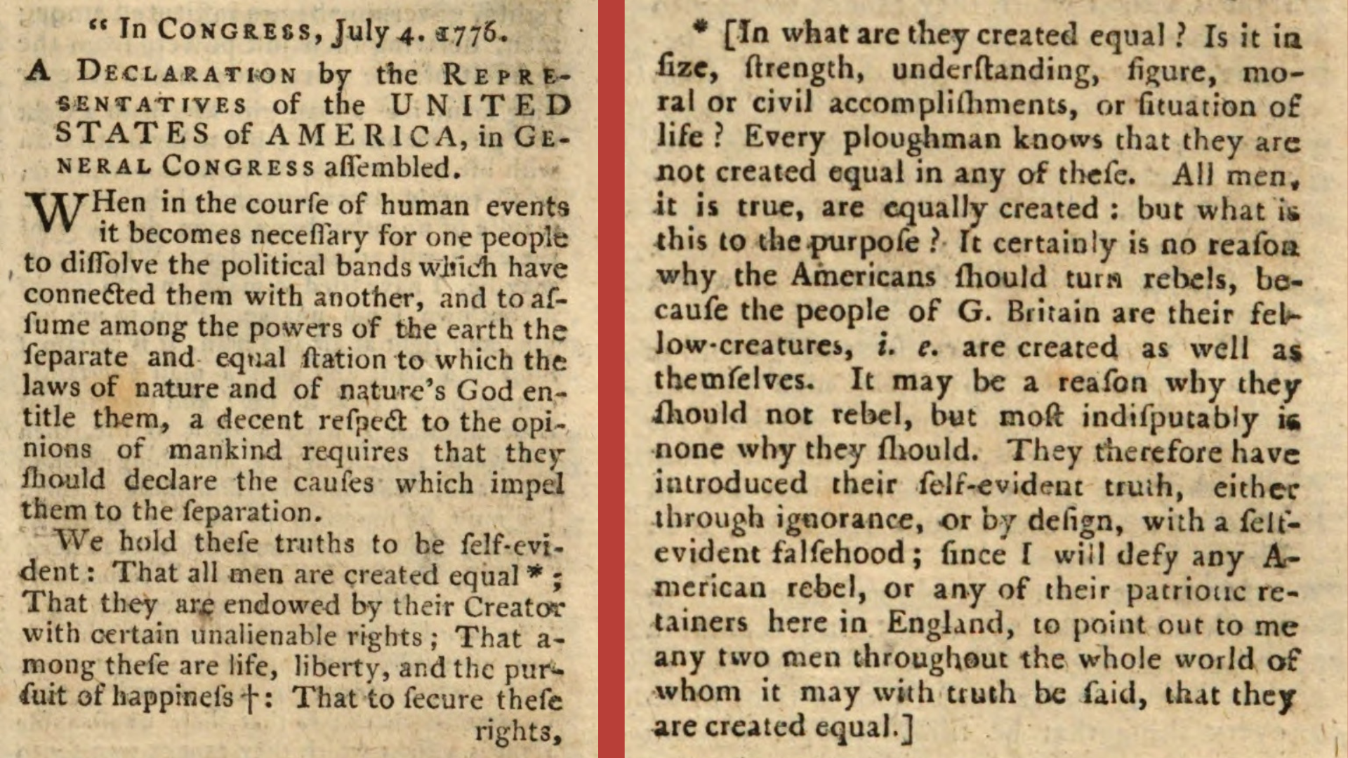 An asterisk following the phrase “all men are created equal” directed readers to a bracketed note. The key point that “An Englishman” wanted to make was that this statement of equality did not justify the decision to declare independence. To his mind, “all men are created equal” was a rationale for reconciliation, not rebellion. The Continental Congress “therefore have introduced their self-evident truth, either through ignorance, or by design, with a self-evident falsehood.”